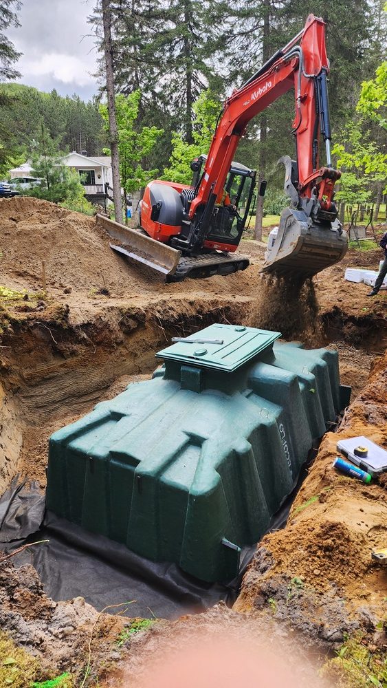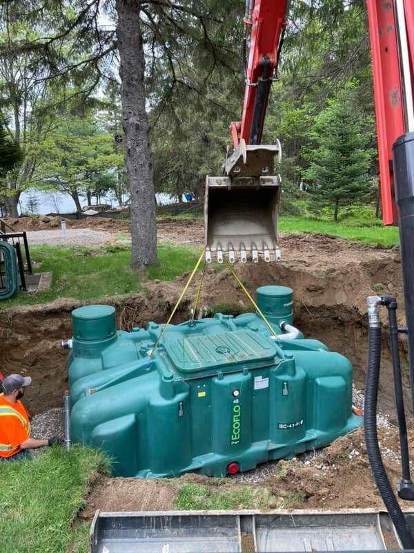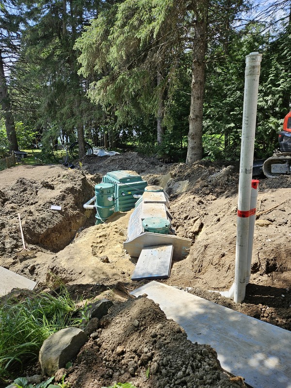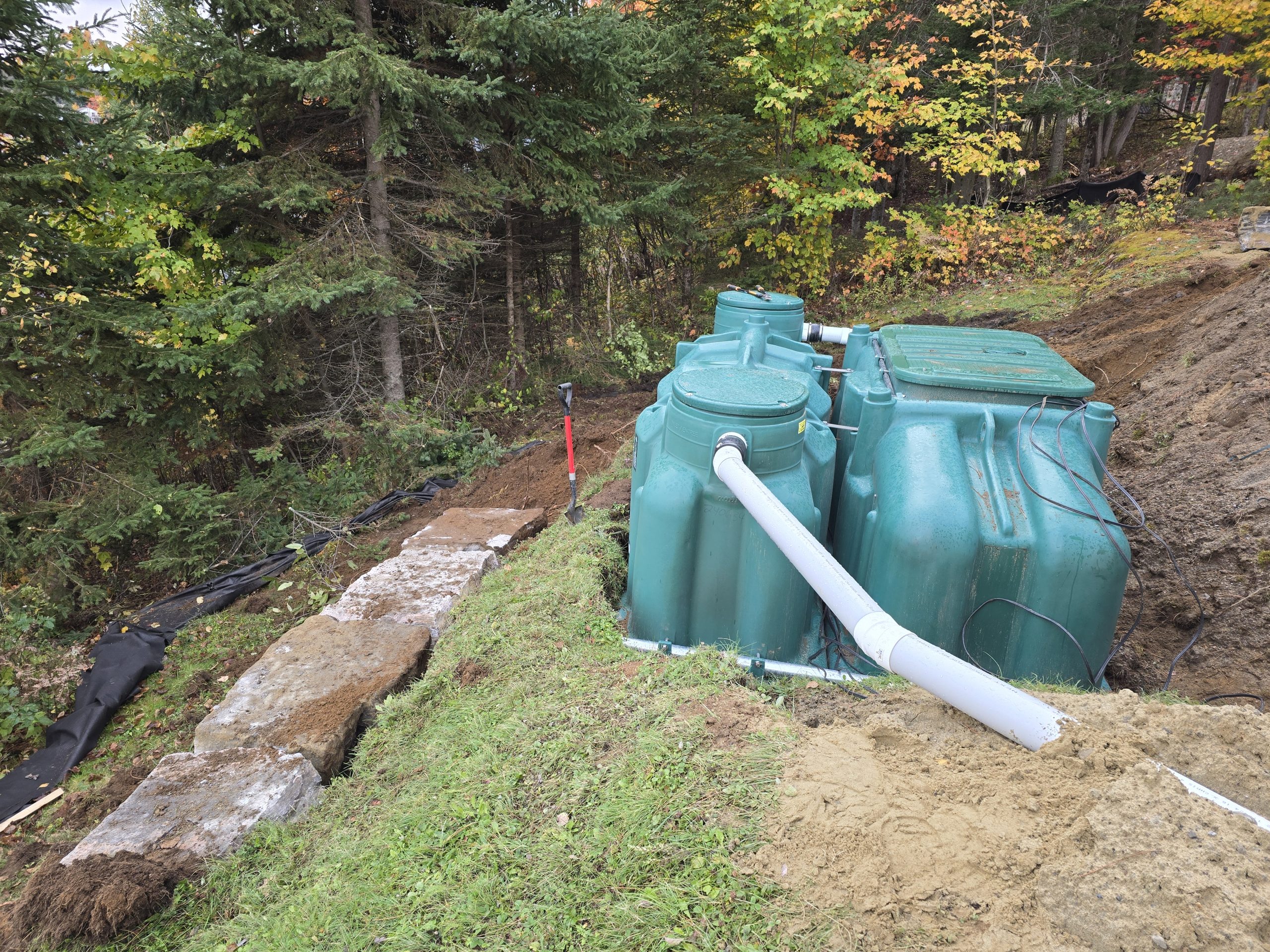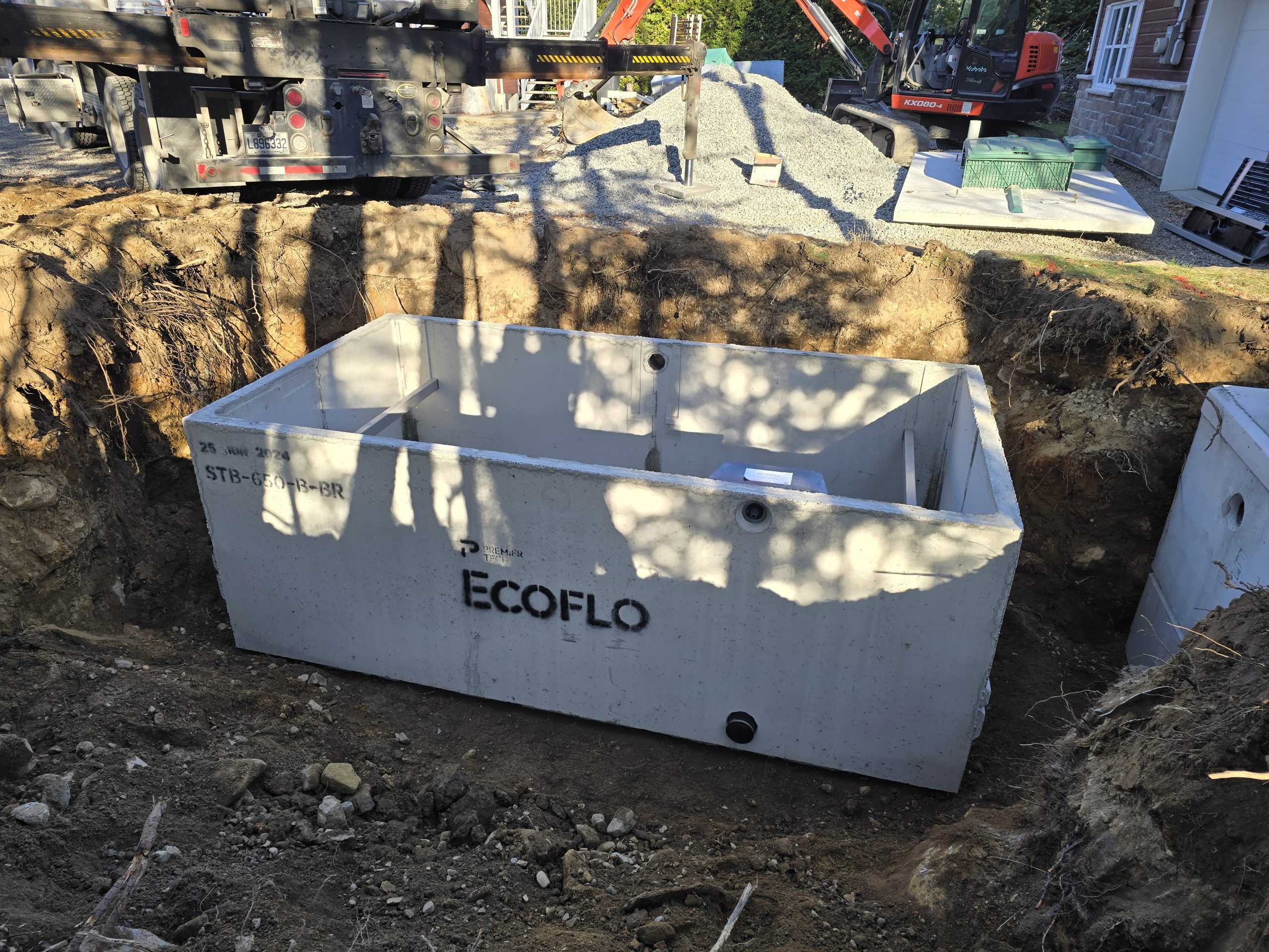 Système Ecoflo ST-650, fosse 750 gallons en béton, suivi d'une station de pompage.