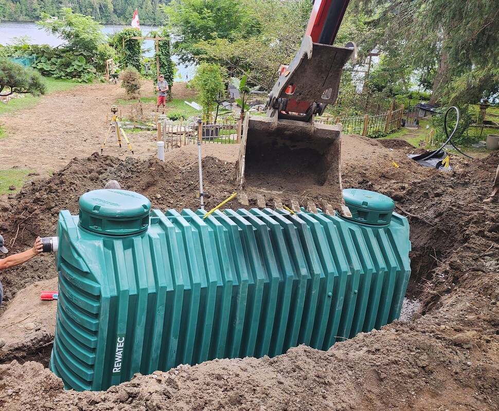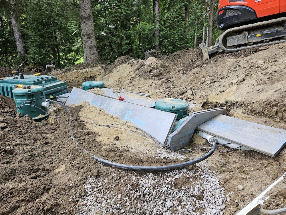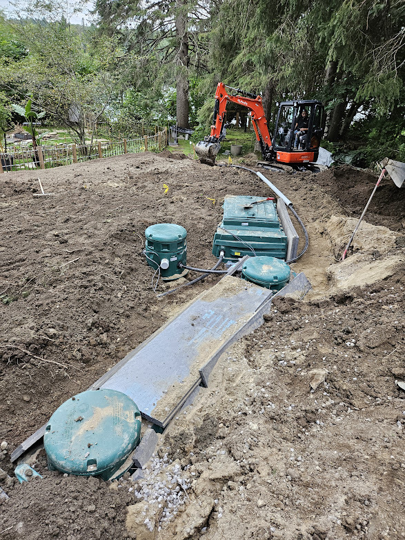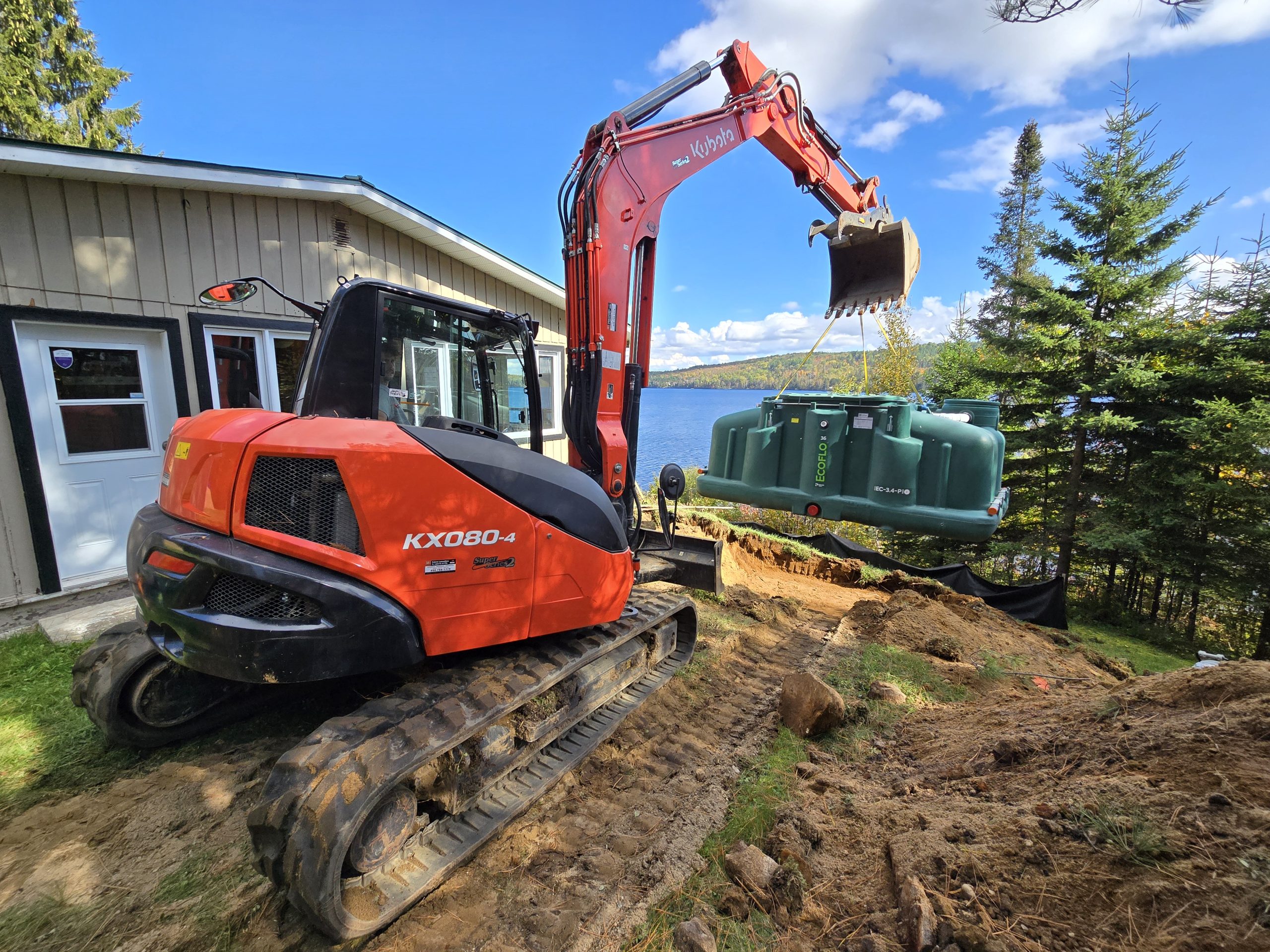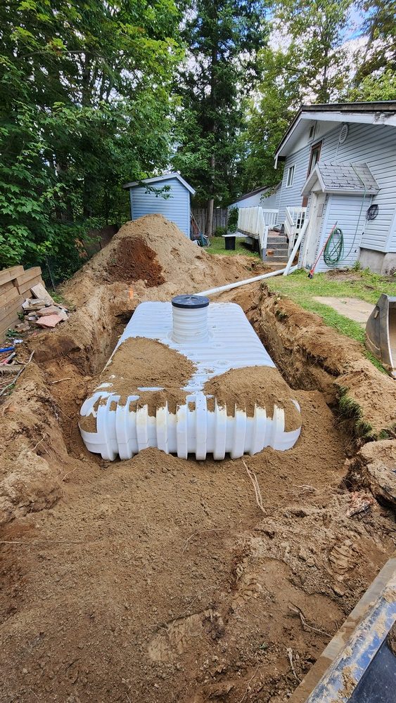 Système Ecoflo ST-650, fosse 750 gallons en béton, suivi d'une station de pompage.
