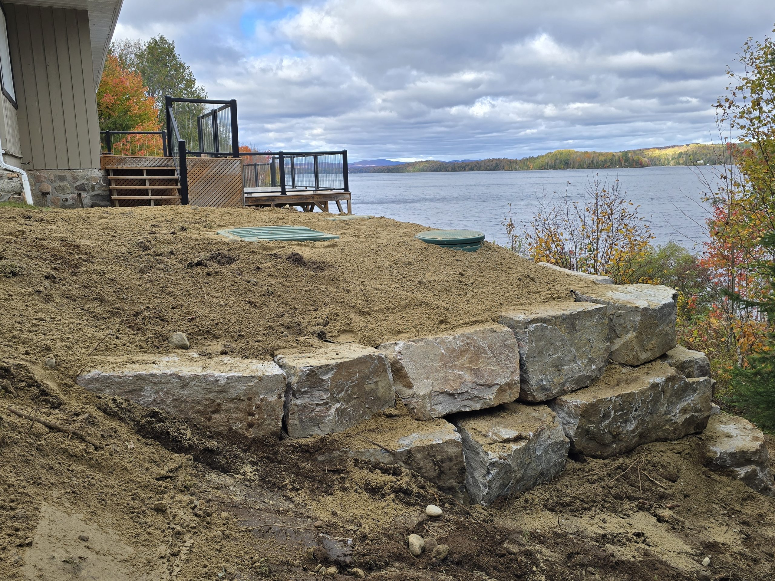 Système Ecoflo avec un filtre à sable hors sol et muret en pierre naturelle.